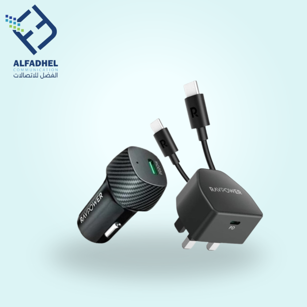 بكج راف باور 3 في 1 :1 راس شاحن جداري 20 واط منفذ PD1 شاحن سيارة 20 واط منفذ PD1 كيبل طرفين تايب سي 1متر
